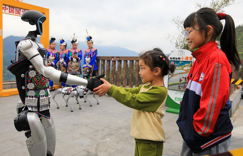 2025年4月26日,在贵州省从江县加榜梯田,少数民族姑娘们同机器狗向游客表演节目。