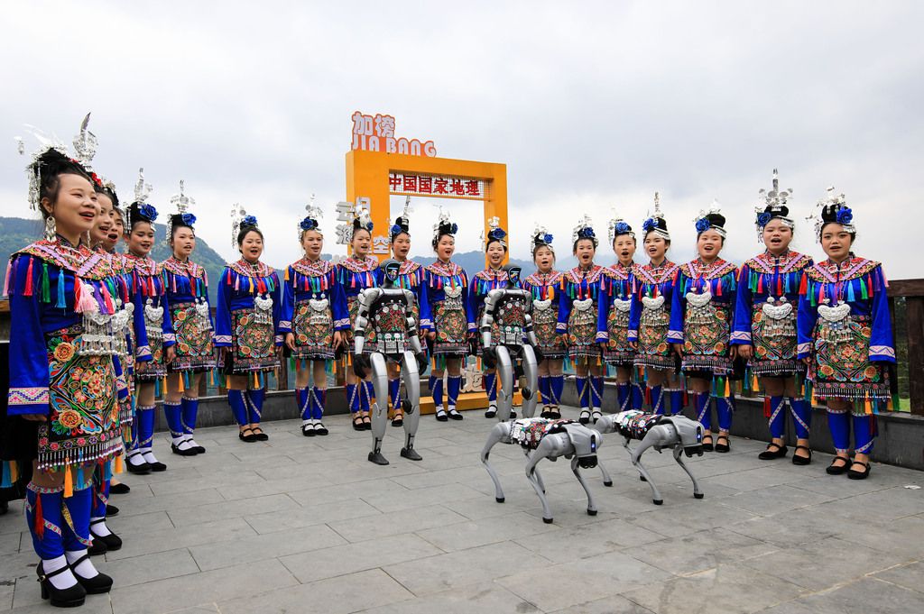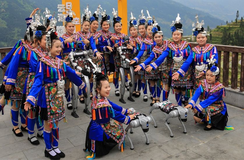 贵州从江:少数民族姑娘与机器狗共同表演节目