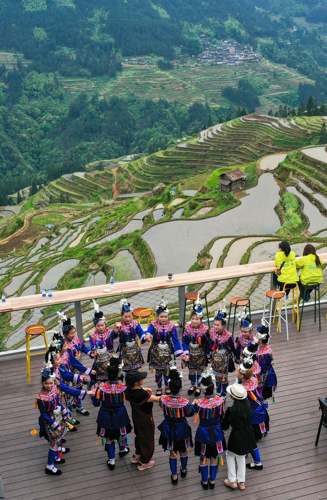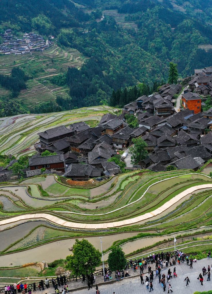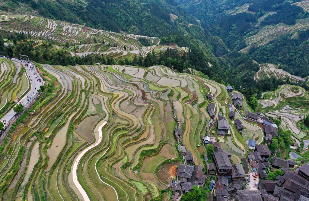 暮春时节,贵州省黔东南苗族侗族自治州从江县加榜梯田进入春耕季,梯田蓄水丰盈、线条分明,景色优美,吸引众多游客前来观光游玩。近年来,从江县依托丰富的梯田资源,推动农文旅融合发展,助力乡村旅游产业发展。
