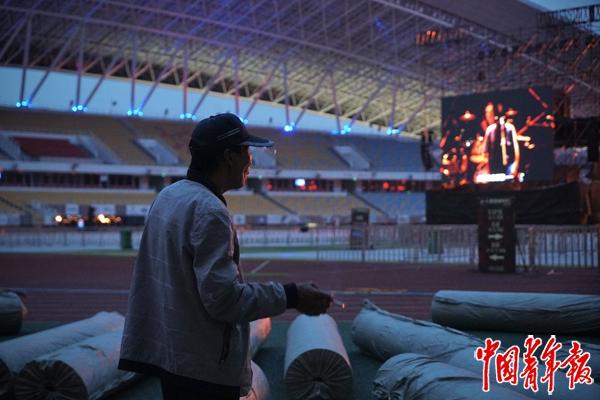 一群从四川来的建筑工人,住在与体育场一路之隔的工棚里,演唱会这几日他们歇工了。有工人也听摇滚乐,还是家乡的民间乐手,被问到为何没买票进去听时,摆摆手。场内摇滚乐队高歌时,他们在临时搭建的工棚里,敲着从家乡带来的木鼓,打着铜镲,等待开工。