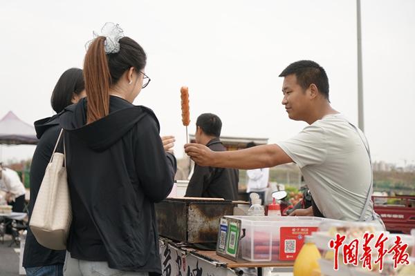 卖烤肠的男人是整条路上最早嗅到商机的人,他提前准备了5000根烤肠,散场时卖得只剩6根,送给了一直守在场外的民警。这一天,他靠卖3元一根的烤肠,收入超过1万元。