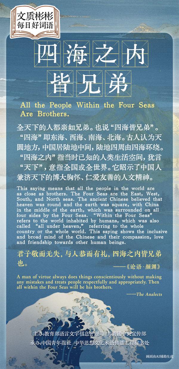 全天下的人都亲如兄弟。也说“四海皆兄弟”。“四海”即东海、西海、南海、北海。古人认为天圆地方,中国居陆地中间,陆地四周由四海环绕。“四海之内”指当时已知的人类生活空间,犹言“天下”,意指全国或全世界。它昭示了中国人兼济天下的博大胸怀、仁爱友善的人文精神。