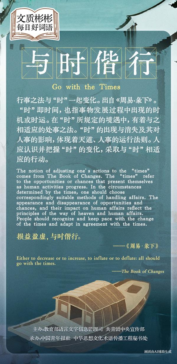 The notion of adjusting one's actions to the "times" comes from The Book of Changes. The "times" refer to the opportunities or chances that present themselves as human activities progress. In the circumstances determined by the times, one should choose correspondingly suitable methods of handling affairs. The appearance and disappearance of opportunities and chances, and their impact on human affairs reflect the principles of the way of heaven and human affairs. People should recognize and keep pace with the change of the times and adapt in agreement with the times.
