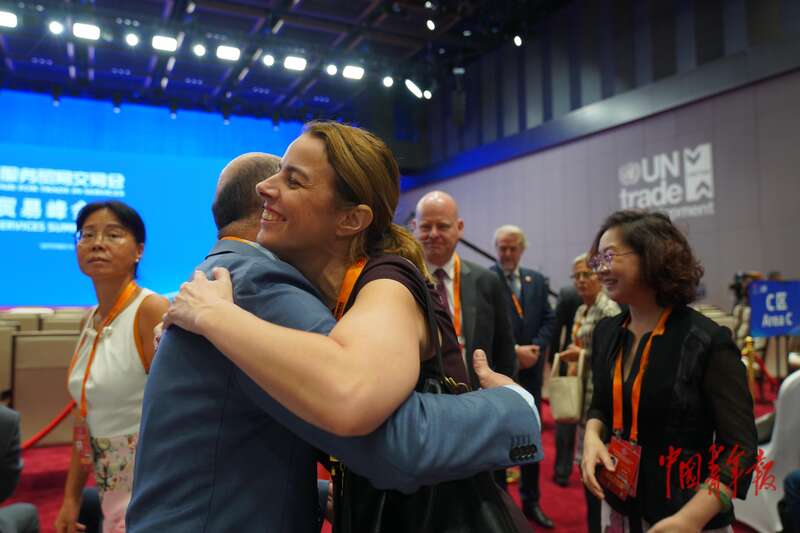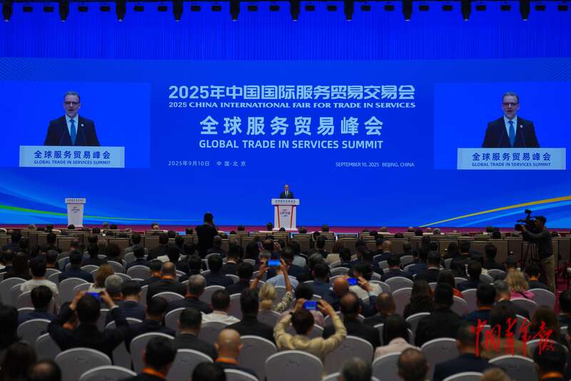 9月10日,北京首钢园,2025年中国国际服务贸易交易会(以下简称“服贸会”)在北京盛大开幕。在开幕式上,联合国贸易和发展会议副秘书长佩德罗·曼努埃尔·马雷诺现场致辞。本届服贸会以“数智领航,服贸焕新”为主题,将举办13场主题论坛、82场专题论坛、81场洽谈推介活动,260余位境内外部长级嘉宾、国际机构负责人等重量级嘉宾将参会交流研讨;发布《中国服务贸易发展报告》等权威报告。澳大利亚、德国以及世界知识产权组织等85个国家和国际组织设展办会,其中25个国家和国际组织在主题展设展。并且,本届服贸会首次在首钢园“一址举办”,期间将举办40余项丰富多彩的配套活动,打造服务消费新业态,举办艺术表演、消费市集、体育赛事、交流酒会等文商旅体融合的多元化活动,促进服务消费、服务贸易和服务投资融合发展。中青报·中青网记者 田嘉硕/摄