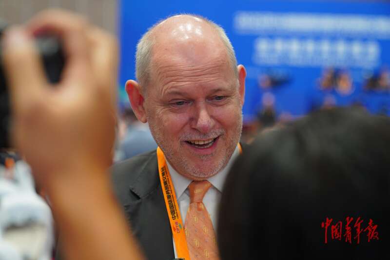 9月10日,北京首钢园,2025年服贸会在北京盛大开幕。开幕式前,一名参会嘉宾正接受媒体采访。中青报·中青网记者 田嘉硕/摄