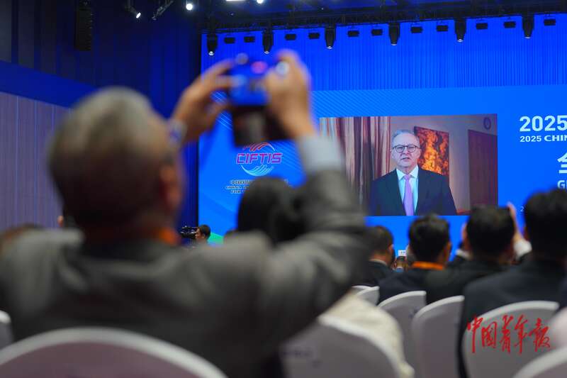 9月10日,北京首钢园,2025年服贸会在北京盛大开幕。开幕式上,参会嘉宾正在倾听澳大利亚总理阿尔巴尼斯的视频致辞。中青报·中青网记者 田嘉硕/摄