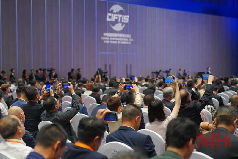 9月10日,北京首钢园,2025年服贸会在北京盛大开幕。开幕式上,参会嘉宾手举手机拍摄联合国贸易和发展会议副秘书长佩德罗·曼努埃尔·马雷诺现场致辞。中青报·中青网记者 田嘉硕/摄