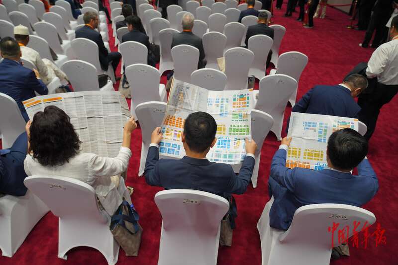 9月10日,北京首钢园,2025年服贸会在北京盛大开幕。开幕式前,三名参会嘉宾在座位上阅读参会指南。中青报·中青网记者 田嘉硕/摄