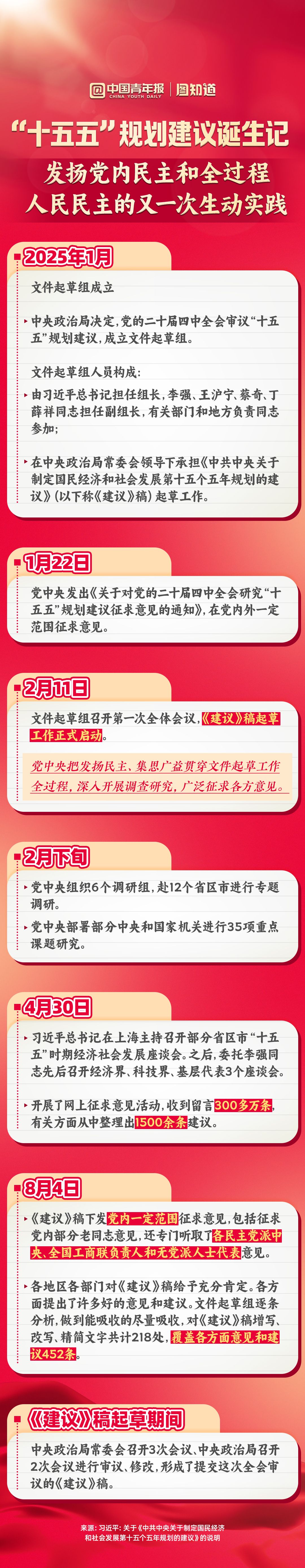 制定中长期规划指导经济社会发展,是我们党治国理政的一种重要方式。研究制定好“十五五”规划,对于推动我国经济社会持续健康发展,为如期基本实现社会主义现代化奠定更加坚实的基础,具有重大意义。这样一份极其关键的文件是如何诞生的?沿着时间线,看“十五五”规划建议的诞生过程,充分感受发扬党内民主和全过程人民民主的生动实践过程。