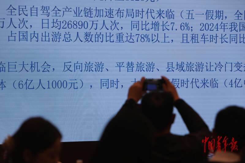 11月26日,北京,青年国潮品牌共创周“青睐”之地文旅主题交流会,一名嘉宾在拍照记录嘉宾发言中有关旅游新趋势的相关数据。中青报·中青网记者 孔斯琪/摄