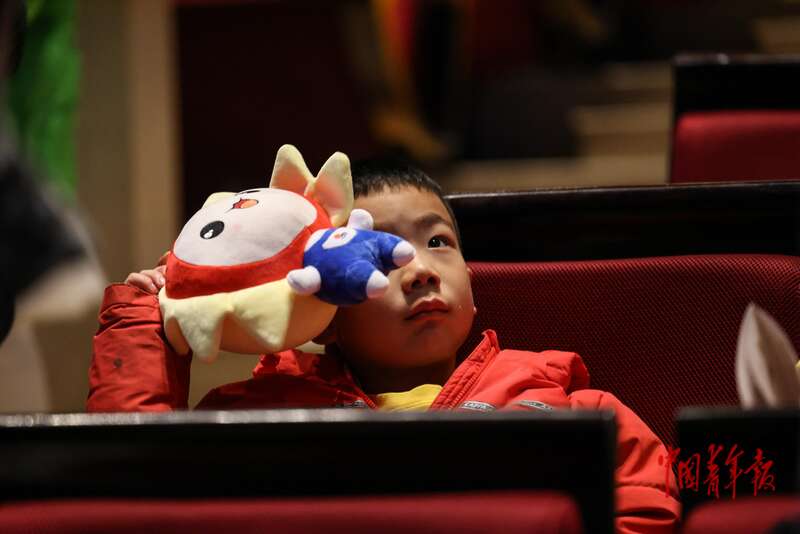 11月23日,北京华侨城大剧院,故宫大型沉浸式儿童音乐剧《甪端》演出现场,一名儿童手里拿着希望工程吉祥物“小希”玩偶。中青报·中青网记者 曲俊燕/摄