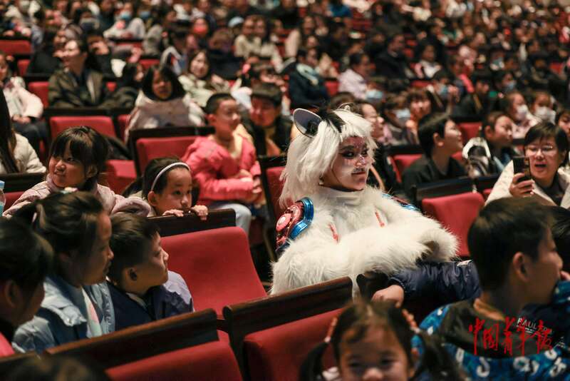 11月23日,北京华侨城大剧院,故宫大型沉浸式儿童音乐剧《甪端》演出现场,演员来到小观众们中间互动。中青报·中青网记者 曲俊燕/摄