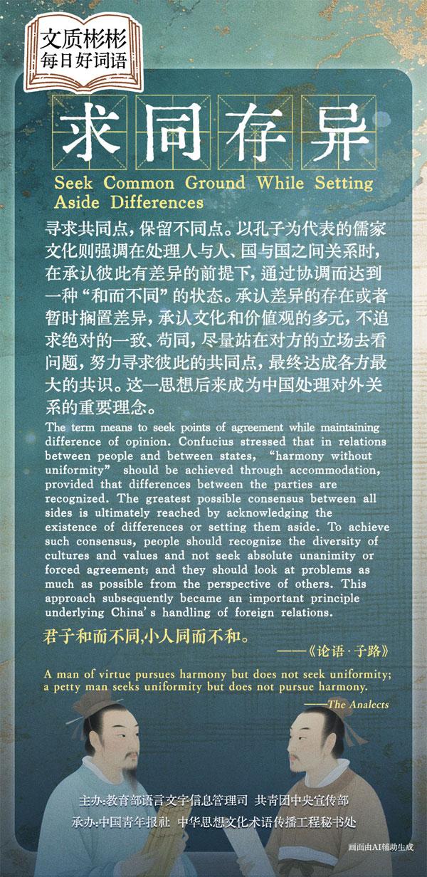 The term means to seek points of agreement while maintaining difference of opinion. Confucius stressed that in relations between people and between states, "harmony without uniformity" should be achieved through accommodation, provided that differences between the parties are recognized. The greatest possible consensus between all sides is ultimately reached by acknowledging the existence of differences or setting them aside. To achieve such consensus, people should recognize the diversity of cultures and values and not seek absolute unanimity or forced agreement; and they should look at problems as much as possible from the perspective of others. This approach subsequently became an important principle underlying China's handling of foreign relations.