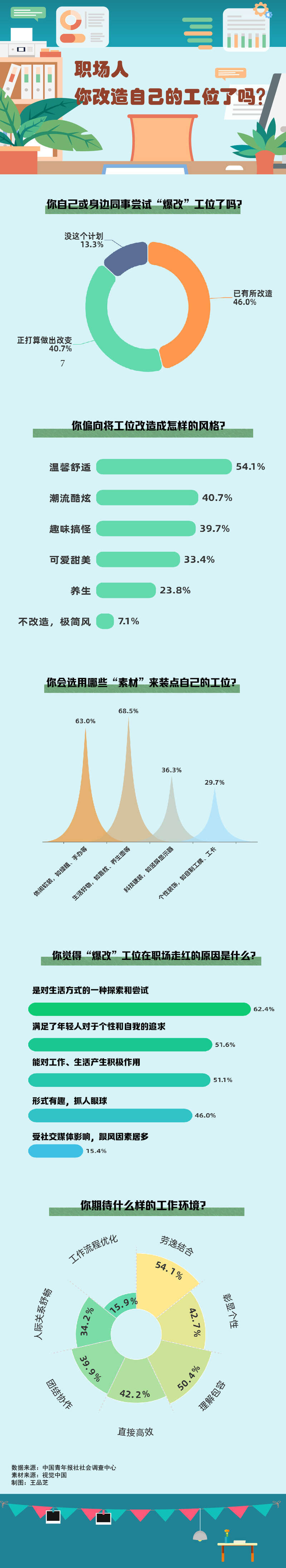 栽培绿植、装饰“手办”、添置生活好物……职场人,你“装修”自己的工位了吗?中国青年报社社会调查中心的一项调查显示,46.0%的受访者表示自己或身边同事对工位进行了改造。“爆改”工位在职场走红,62.4%的受访者认为是对生活方式的一种探索和尝试,51.6%的受访者觉得满足了年轻人对于个性和自我的追求。