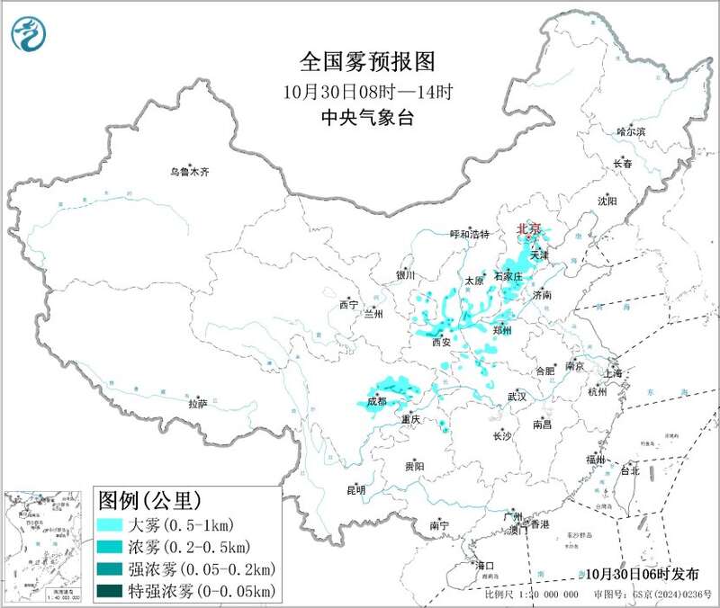 10月30日早晨至上午,北京、天津西部、河北中南部、河南北部、山西南部、四川中部、重庆西部、湖北西北部、陕西中部、甘肃陇东等地有大雾,其中,北京南部、河北南部、河南北部、四川中部、湖北西北部等地的部分地区有能见度不足500米的浓雾,局地有能见度不足200米的强浓雾。