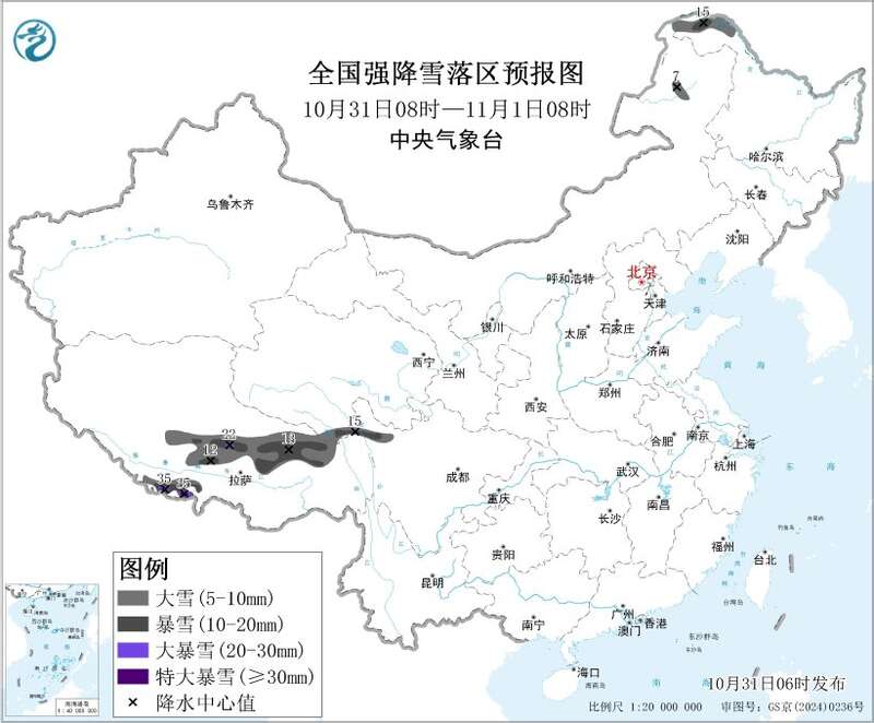 预计10月31日08时至11月1日08时,西藏中东部和西南部、川西高原北部、黑龙江西北部、内蒙古东北部等地部分地区有大到暴雪,其中,西藏中部局地有大暴雪,西藏西南部局地有大暴雪或特大暴雪(30~35毫米)。上述部分地区新增积雪深度4~8厘米,山区局地可达15厘米以上。