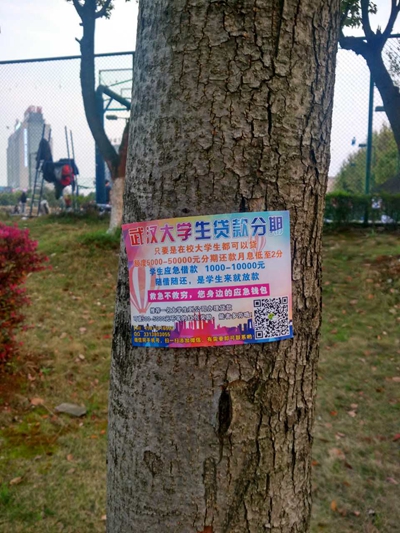现在,诸如“武汉大学生贷款分期”的小广告还在郑禹的母校俯拾即是。它们声称“是学生来就放款”,“不看征信,不打父母电话”,“推荐一名大学生,可获500~5000元奖励,能者多劳”。