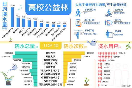 当天,活动上线仅7分钟,郑州大学公益林就种出了第一棵樟子松。中青校媒与蚂蚁金服旗下支付宝联合发布的数据显示,郑州大学在活动上线当日浇水量超过21.53吨,该记录至今仍未被打破。目前,复旦大学、郑州大学、南京林业大学是位列高校公益林排行榜前三的院校。其中,郑州大学占据高校公益林日榜首天数最多,复旦大学、南京林业大学紧随其后。