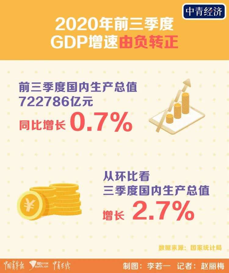 10月19日,国家统计局发布数据,初步核算,前三季度国内生产总值722786亿元,按可比价格计算,同比增长0.7%。疫情大考下,今年中国经济已实现正增长,成绩来之不易。分季度看,在一季度同比下降6.8%、二季度同比增长3.2%的基础上,三季度增速加快至4.9%,呈现稳定恢复增长态势。详情>>