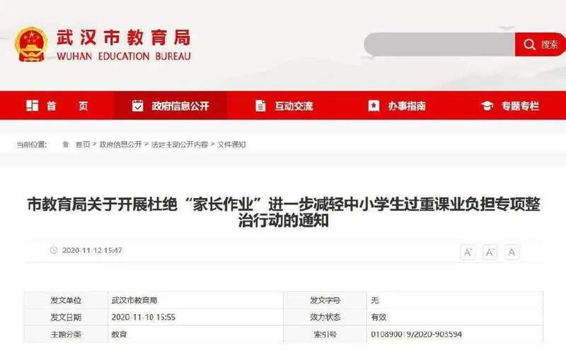 11月12日,武汉市教育局发布通知,要求即日起在全市范围内开展杜绝“家长作业”进一步减轻中小学生过重课业负担专项整治行动。通知要求,严控书面作业总量。小学一二年级不布置书面家庭作业,三至六年级家庭作业不超过60分钟,初中家庭作业不超过90分钟,高中也要合理安排作业时间。不得给家长布置作业或让家长代为评改作业。详情>>