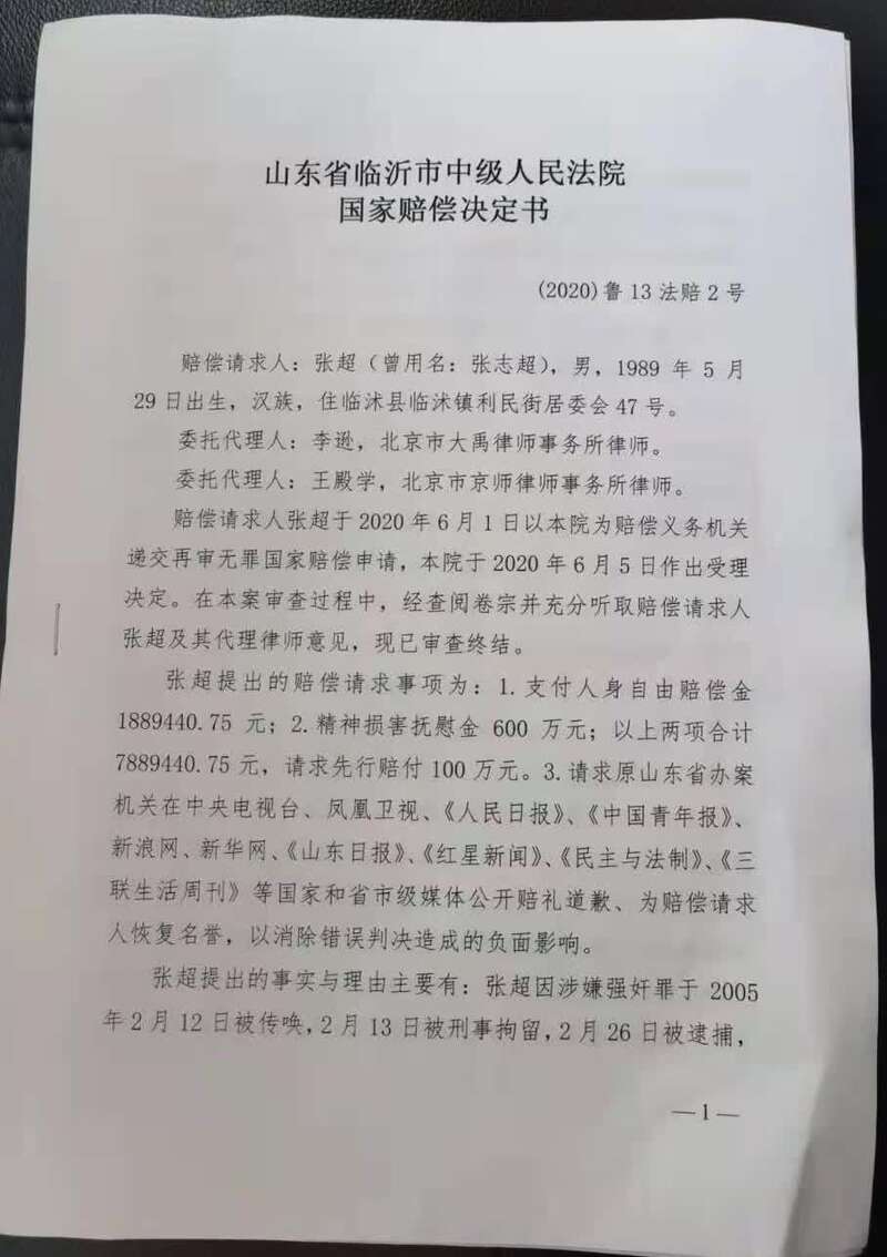 去年6月1日,张志超正式向临沂市中级人民法院递交了788.9万元的国家赔偿申请,包括5449天的侵犯人身自由赔偿金188.9万元以及精神损害抚慰金600万元。此外,张志超还希望原办案机关通过《人民日报》《中国青年报》等媒体公开赔礼道歉。
