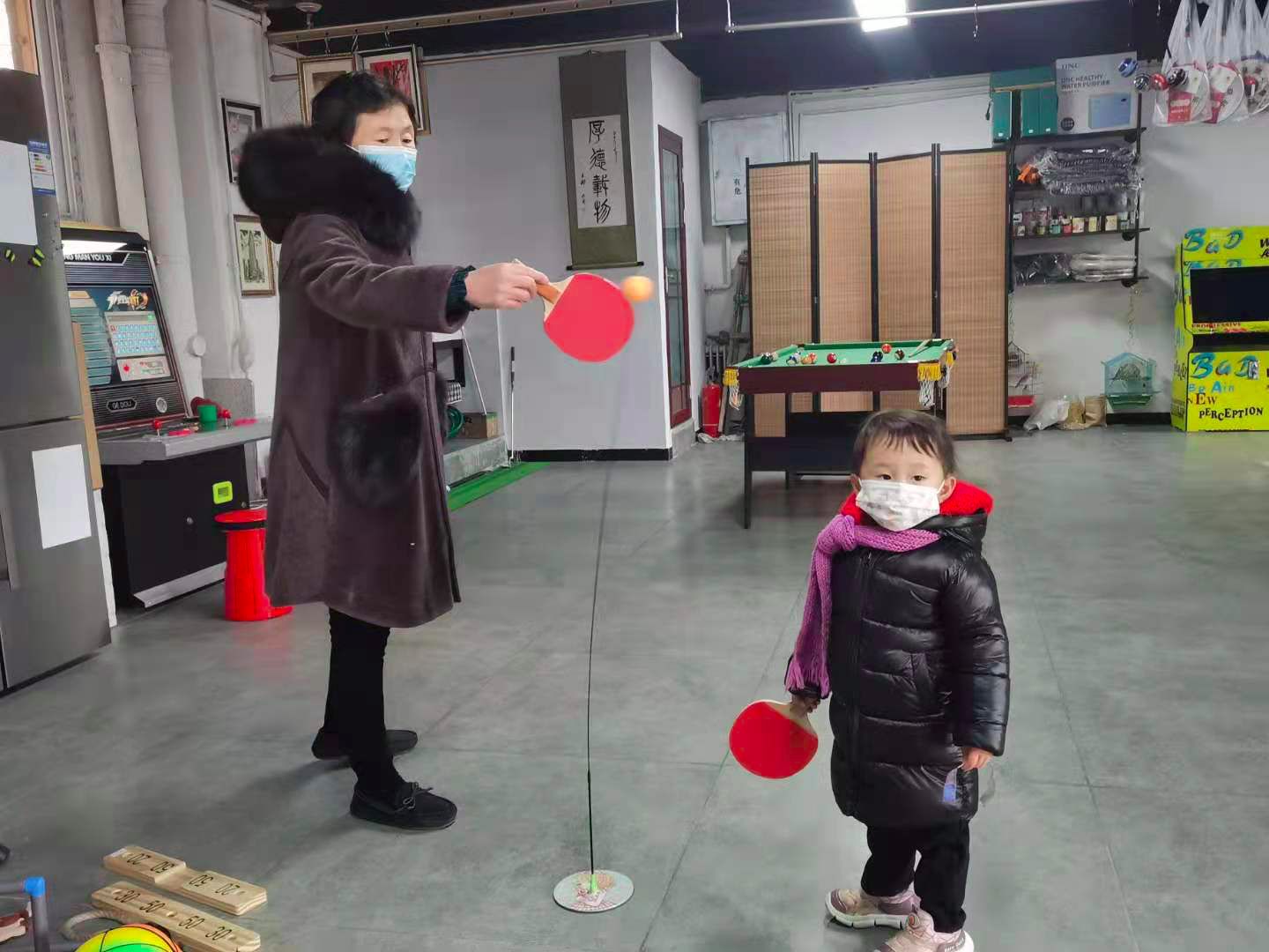 一对祖孙在店里打乒乓球。