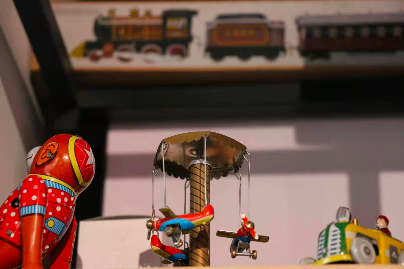 一位老人在店里玩玩具。