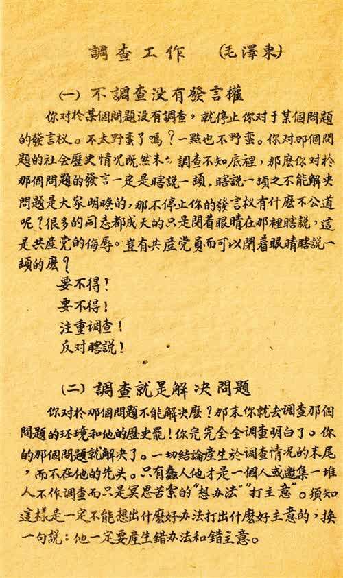 毛泽东对调查研究是有着深刻的认识的。早在1920年3月14日,放弃去法国留学机会的毛泽东就在致周世钊的信中写道:“欲改造中国,有两件事是最为急迫的:其一,是对中国历史上的治理经验加以系统地整理与批判;其二,是做实地的调查研究,而这两项当务之急的工作,都不能在国外做。”从那时起,他便坚定了留在国内研究中国的信念。
