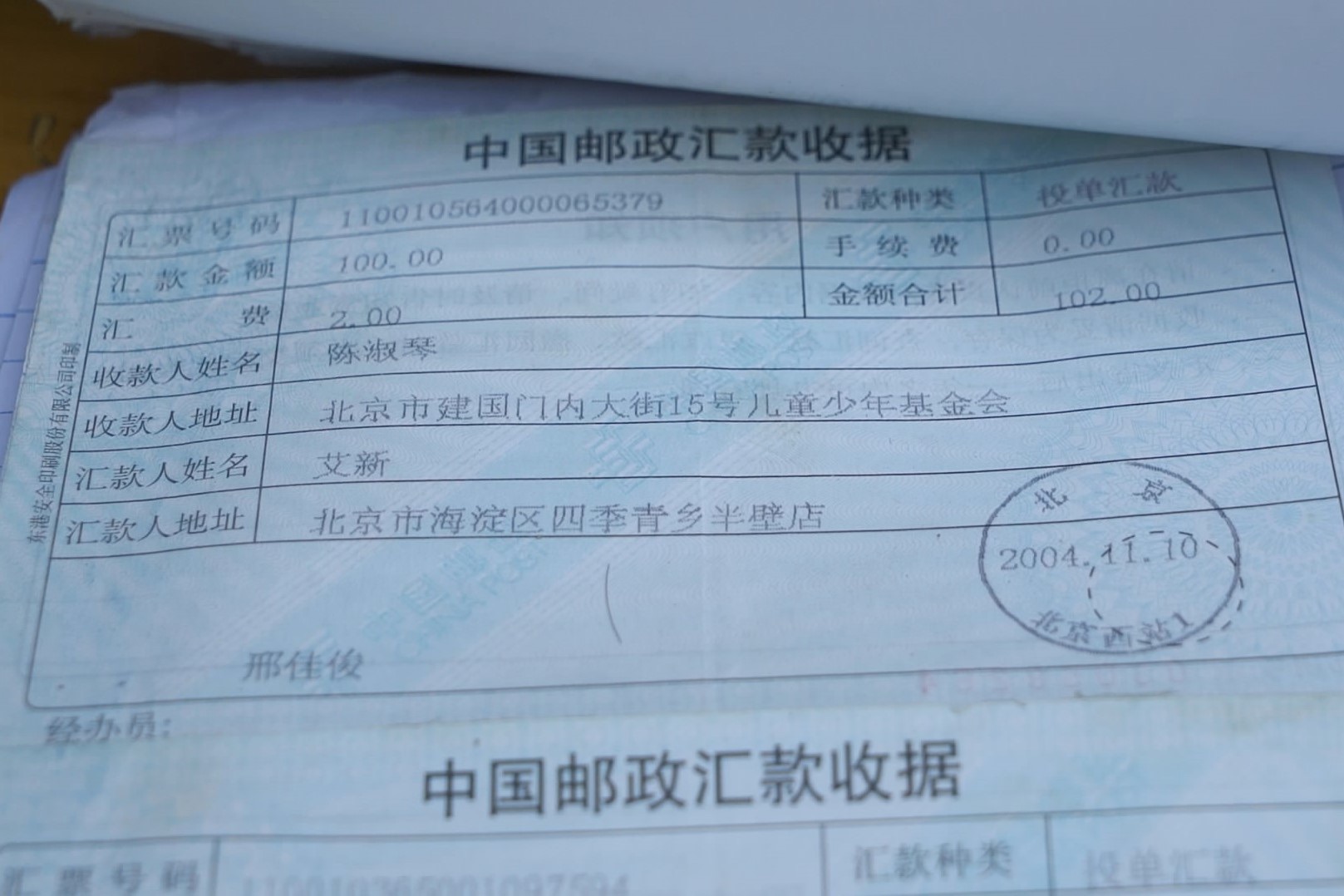 在早期的一些汇款单上,他甚至并未使用真名。他的有些汇款收据上,姓名一栏写着“艾新”,后来还出现过“冯贤”,那是“爱心”与“奉献”的谐音。中国儿基会的过往账目里,以“冯贤”名字的捐款,从2005年10月至2009年7月,共计19050元。
