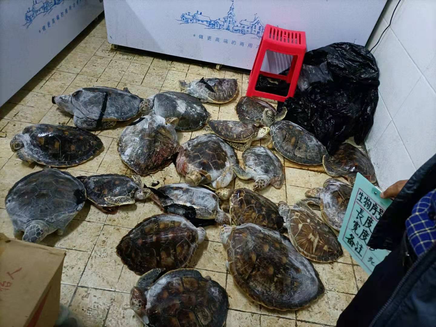 钟帅去看望寄养在徐州某家水族馆的涉案海龟,工作人员从冰柜里拿出海龟的尸体。李自强也无从得知,那位“优雅的女士”在疫情期间是否活了下来。它早就混在涉案海龟中,“住”进水族馆里。
