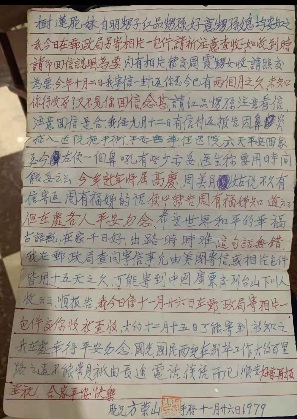 上世纪70年代,朱红品曾替家人跟大舅公通过信,方荣山的信中经常有一句“世界大战难免,希望世界和平。”那时方荣山已经很老了,总是在信里说着鼻子不舒服、眼睛生病了。