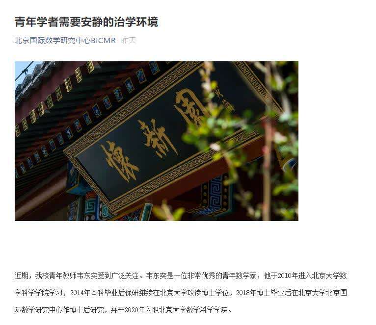 科学家们的前沿研究你我看不懂也无妨,但请别因此将镜头转向人家的私生活,更不必“标签化”他们。对学者来说,尤其对青年学者来说,过分的关注绝不是一件好事。科学的发展从来也不是靠舆论的关注,是他们在安静中的默默躬耕。想起中青报冰点周刊写北京国际数学中心的那篇著名的《特区》,“特区”之特,就在于免于各种非专业因素的干扰,按数学发展的规律和国际惯例来做,不让数学家们“分心”。这个“不干扰”,应该也包括流量逻辑。对于流量,你觉得是热闹,他们觉得是吵闹。听说写《特区》这篇稿件时,记者已经知道了“韦神”的传说,但记者没有写进稿件,没有去“打扰”一个学生,这是媒体对科学和“特区”应有的专业和善意。