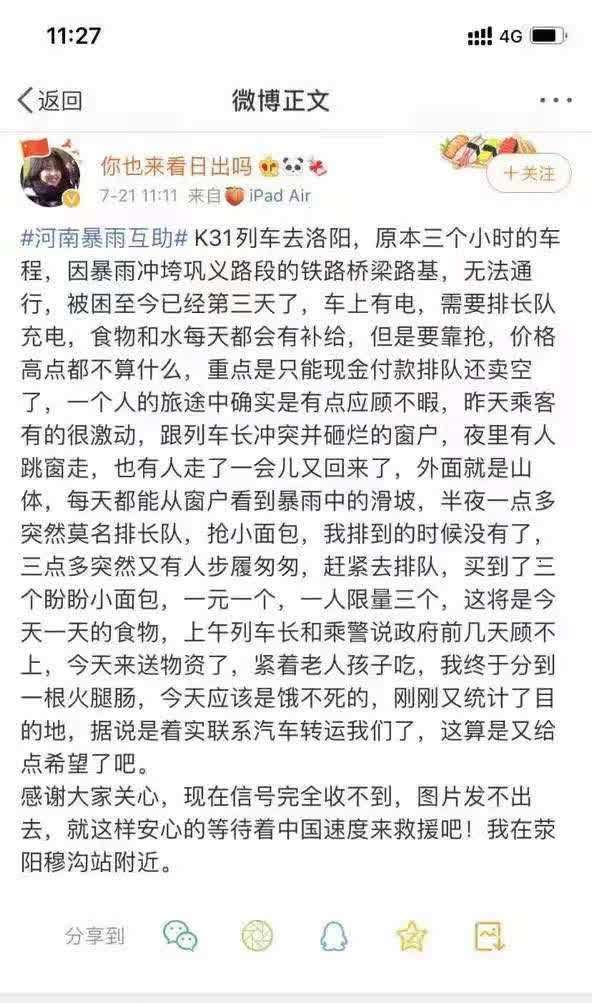 据官方消息,目前,铁路部门紧急安排毗邻站(上街车站)抽调人员,于21日凌晨5点30分将30箱水、400个面包、5箱火腿肠等重要生活物资运送到车站附近,徒步搬运到车站,送上列车。