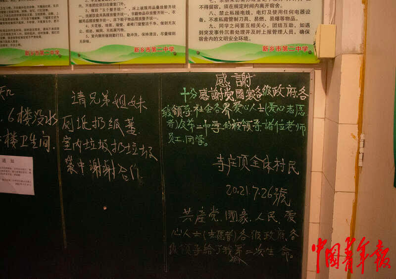 7月27日晚,河南省新乡市牧野区,新乡市第二中学安置点,安置于此的寺庄顶村村民在宿舍楼梯间黑板上留下感谢的话。中青报·中青网记者 李峥苨/摄