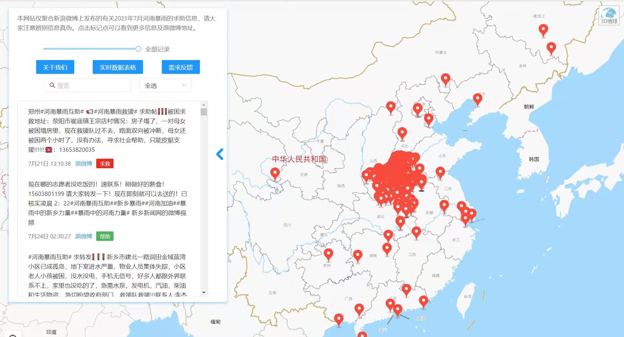 李天石思考,能不能建一个网页,将求助消息的地理位置提取出来,标注在地图上,以二维的、扁平的图像直观地呈现灾情。