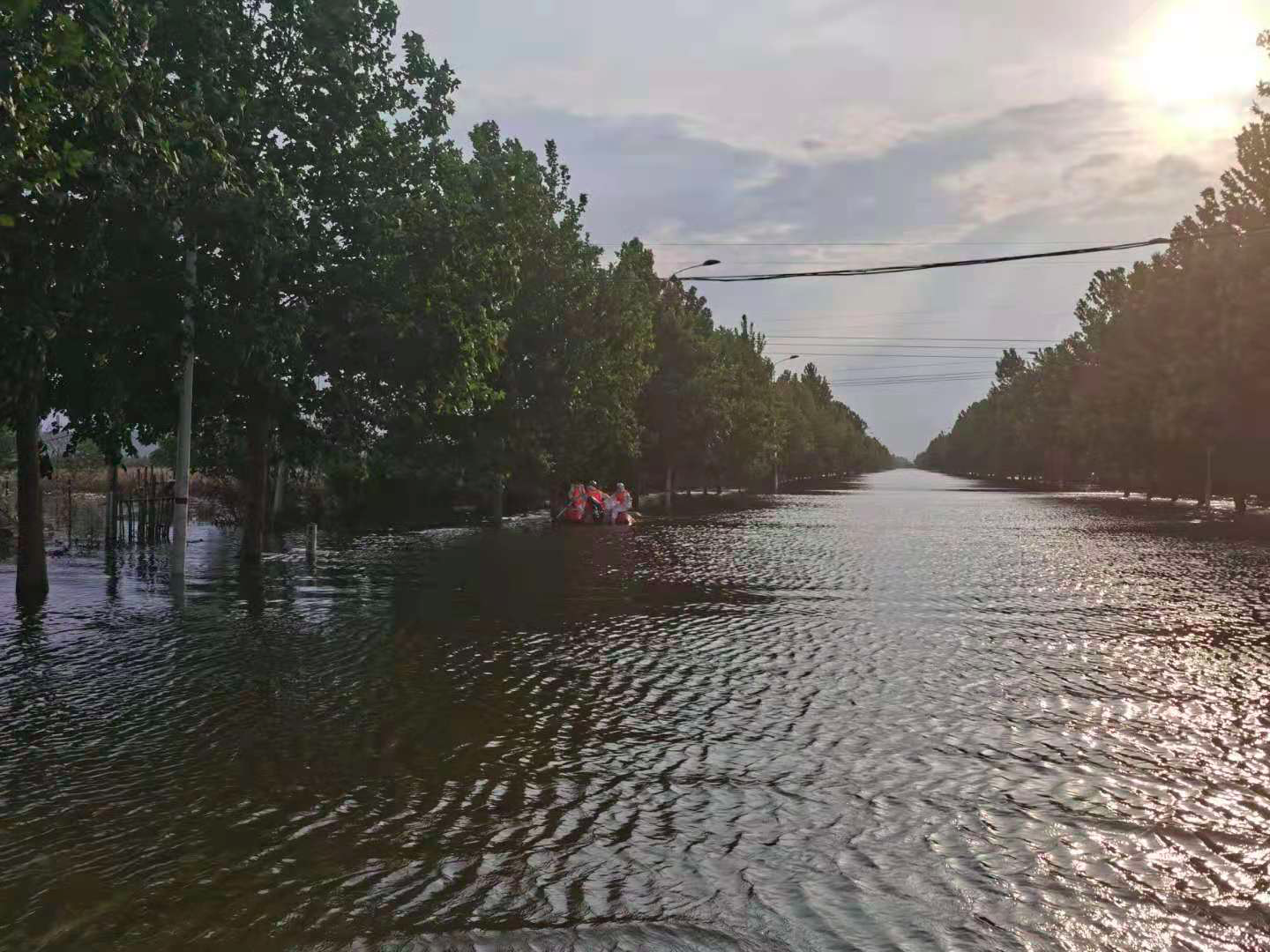 几乎在塑料船出社区东门时,谭立、赵同亮分别驾驶着本队的救生艇拐过那个十字路口,准备返回社区继续转移居民。他们一前一后,相距100米左右。