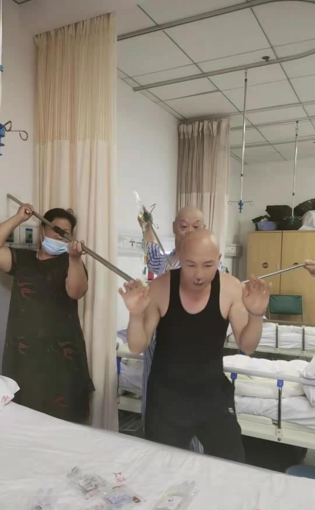 在那些滑稽的片段里,护士配合他演出,举起超大号的注射器扎向他的手臂;住院医师罗丹扶着他的手给他递醋瓶假装麦克风,等赵新志一开演,罗丹和一位病友家属捂起耳朵笑着跑出镜头外。在这些视频里,病友顾建华总是不经意冒头,他有时坐着,有时躺着,但一直看着赵新志笑。