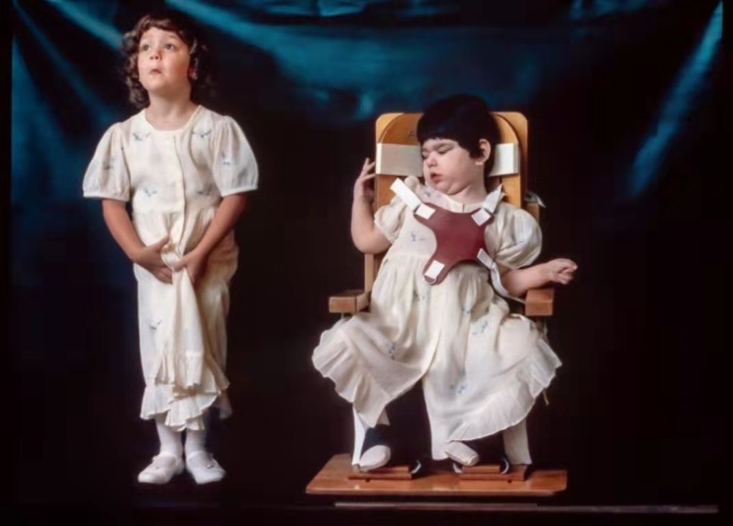 加比在一个特制的木架子里,米歇尔为了训练加比的腿力,正把她竖起来。小米歇尔在楼上的粉红色卧室里玩耍。她一个人躲在洗手间对着镜子自言自语,仿佛在和自己的影子姐姐玩过家家。小米歇尔有着秀兰·邓波儿一样的鬈发,口齿伶俐,讨人喜欢,常常开怀大笑,酷爱舞蹈。双胞胎的祖母兼养母米歇尔剪了很短的深色短发,语速快而果断,走路、做事雷厉风行,同时处理着好几件事情,没有停歇的时候。