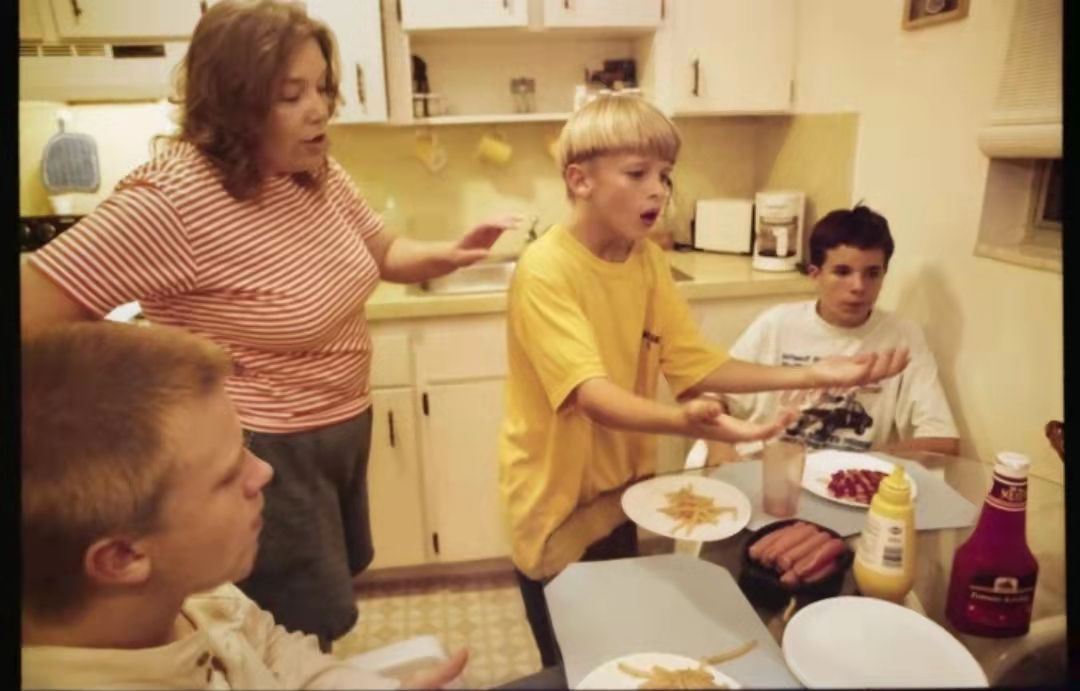 我特意等到晚饭的时候。这家人用一共花了7美元买的热狗和薯条做晚餐。因为炸薯条分配得不均匀,引起了争吵,妈妈在争执中企图让自己的儿子平静下来。