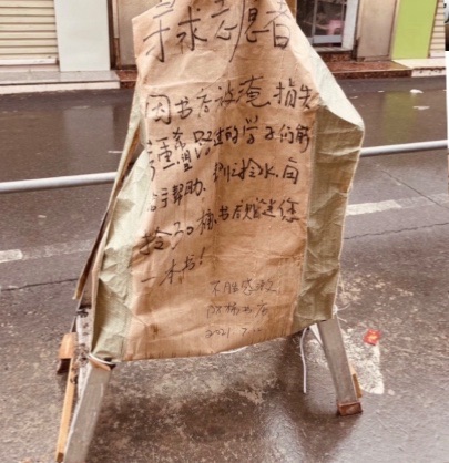 连续两天铲水、抽水,也无法抵挡倒灌的积水。吴小炬的脚背因为泡水而感染。第三天,他开始广泛求助,在几张包书的牛皮纸上,用黑色防水笔写下寻找志愿者的告示,摆到街面上。“拎水送书,30桶送一本。”