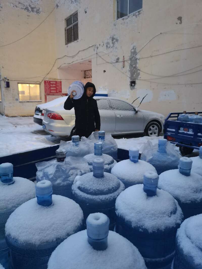 2021年11月8日,内蒙古通辽市遭遇特大暴雪,扎鲁特旗鲁北镇,在风雪中坚持送水的小哥。视觉中国供图