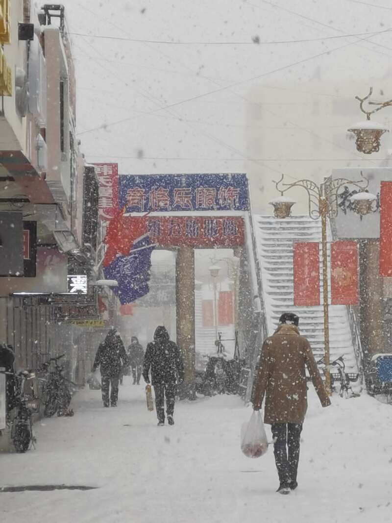大雪之下,人们依照旧日经验,维持这个城市的运转。通辽市科尔沁区清河镇邢家窝堡村村委会当会计的詹贵,负责主街的清雪任务。他开着铲车,来回地在700米长的主街上缓慢移动。作为主街上唯一的人,他在和暴雪较劲,推雪铲快速地把车前的积雪铲离地面,但天上飘着的小雪,又落在地面上,铺成薄薄的一层雪。