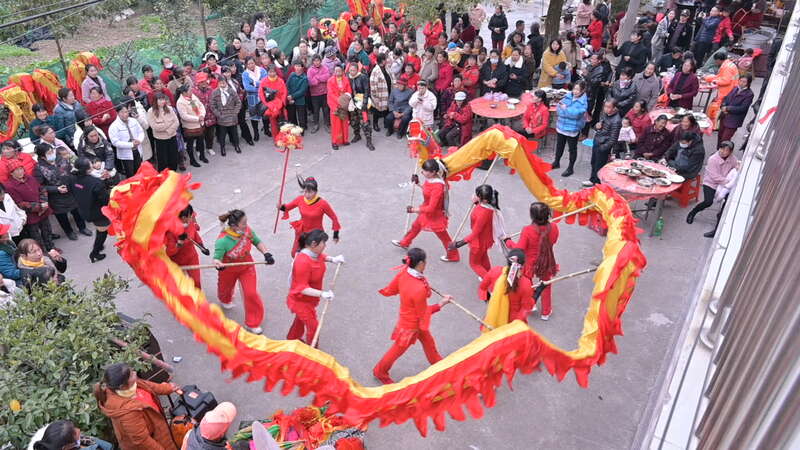 此前,这家人几乎都被家人、朋友、亲戚、媒体记者、网络主播团团围住。在他们抵达监利前,四支舞龙队早在村口等候,路边放着提前准备好的鞭炮和礼花。孙卓从没见过那么多人,家人甚至摆起流水席,宴请乡亲。
