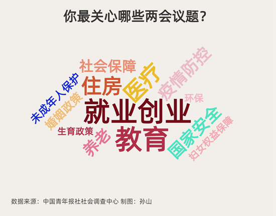 调查中,受访者关注的两会议题还有:社会保障(47.3%)、婚姻政策(41.9%)、未成年人保护(40.6%)、环保(37.9%)、妇女权益保障(37.8%)和生育政策(36.6%)等。