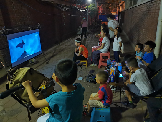 今年夏天,新冠肺炎疫情平稳之际,天津市一个社区大院里,一位家长为孩子们播放“露天电影”。“露天电影”的放映成了孩子们放学后最期盼的时光。刘筝/摄
