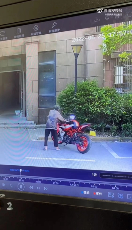 等到第二天保安队长上班,他在监控视频中看到一个走路有些跛脚的老人路过时,试图将摩托车推翻在地,因为瘦弱,老人第二次双手用力尝试才成功。