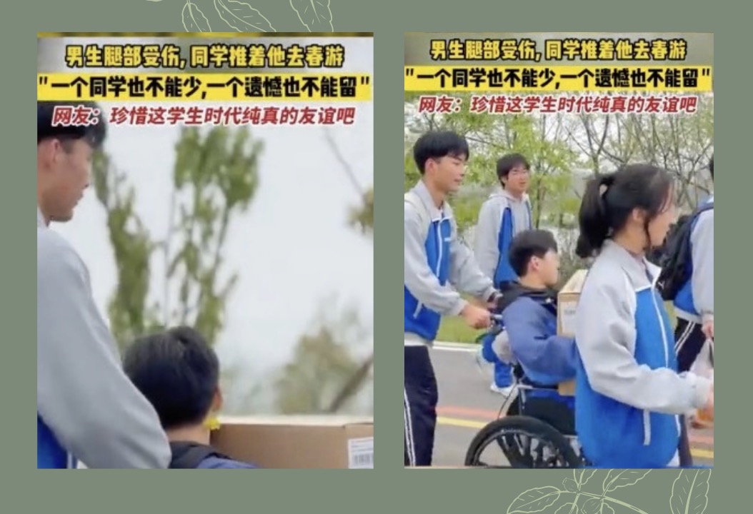中国人的故事|高中男生腿受伤,同学推着他参加春游