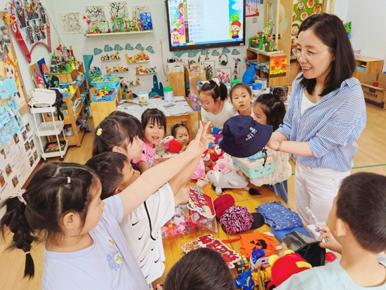 多年的教学经验让孙秋宁觉得幼儿教师的角色实际上是多样化的。在日常的教学工作中,老师需要在面对不同情况灵活转换状态。“我们需要有天真的外在,就是要让自己成为小孩儿,和孩子们‘打成一片’,成为他们生活中的好朋友、游戏中的好伙伴;但更需要有成熟的内在,我们是孩子的老师,是孩子成长路上的引路人、学习发展中的支持者。无论哪种角色,教师必须是‘儿童为本’的积极倡导者和践行者。”孙秋宁说。