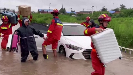 7月30日,河北廊坊,消防员将被困人员、及其财物从车内转移到安全地带。(视频截图)
