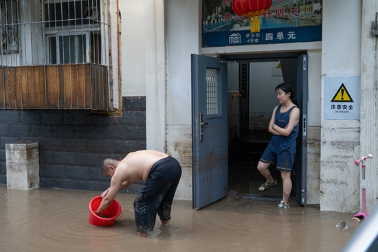 7月31日,北京,门头沟区桥东街小区,一层房屋进水的住户,在水退下后清理房屋。视觉中国供图
